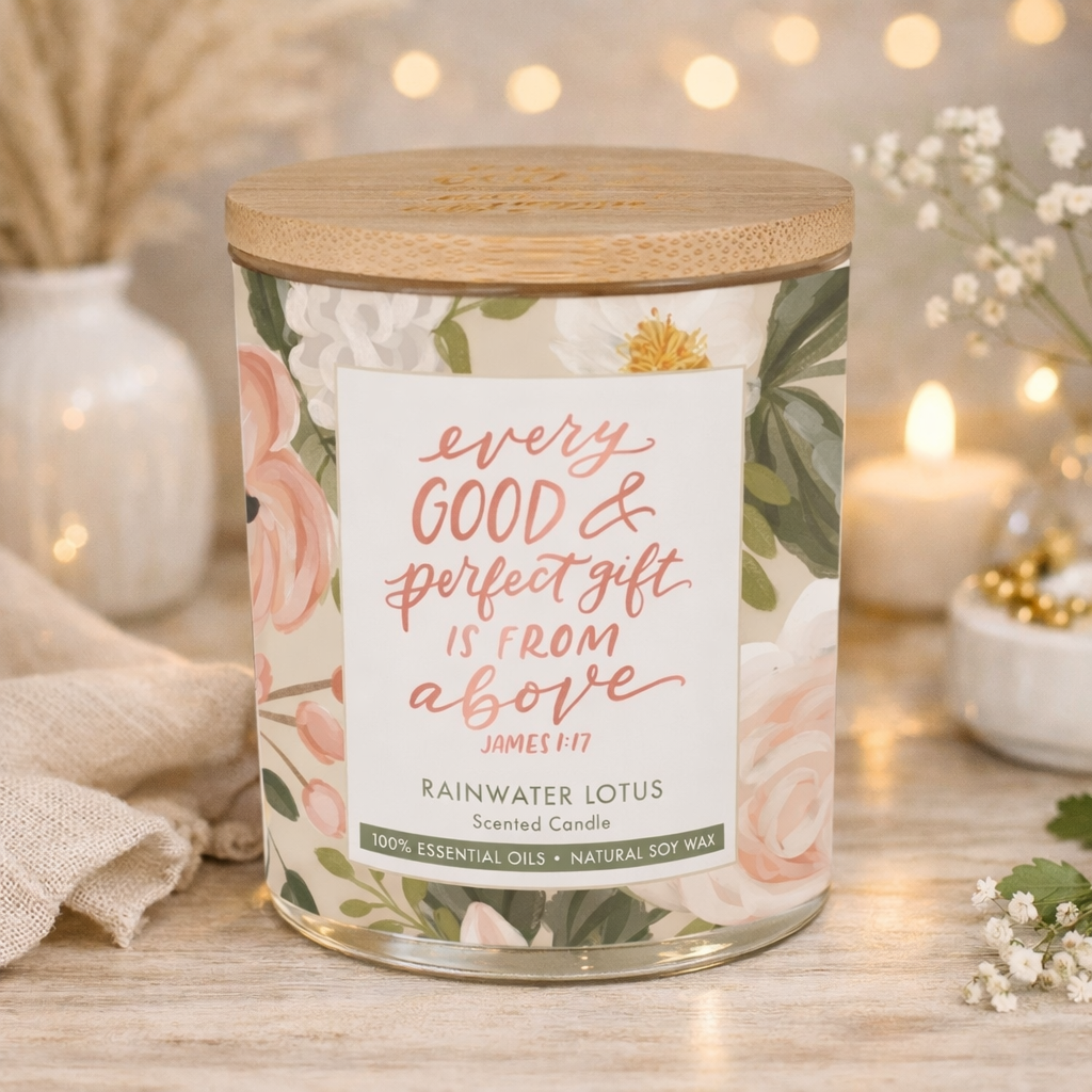 The Every Good and Perfect Gift Rainwater Lotus Scented Candle in a Glass Jar gently nudges you to live with gratitude. Pause and look around. Sometimes, the very best blessings are already right in front of you.